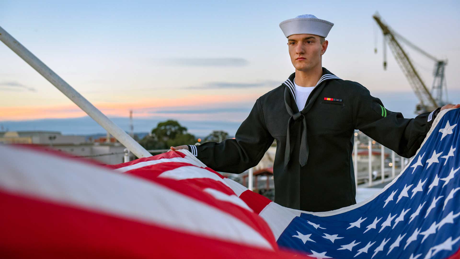 A Navy Sailor helps fold the United States flag during an evening colors ceremony aboard a Navy ship.